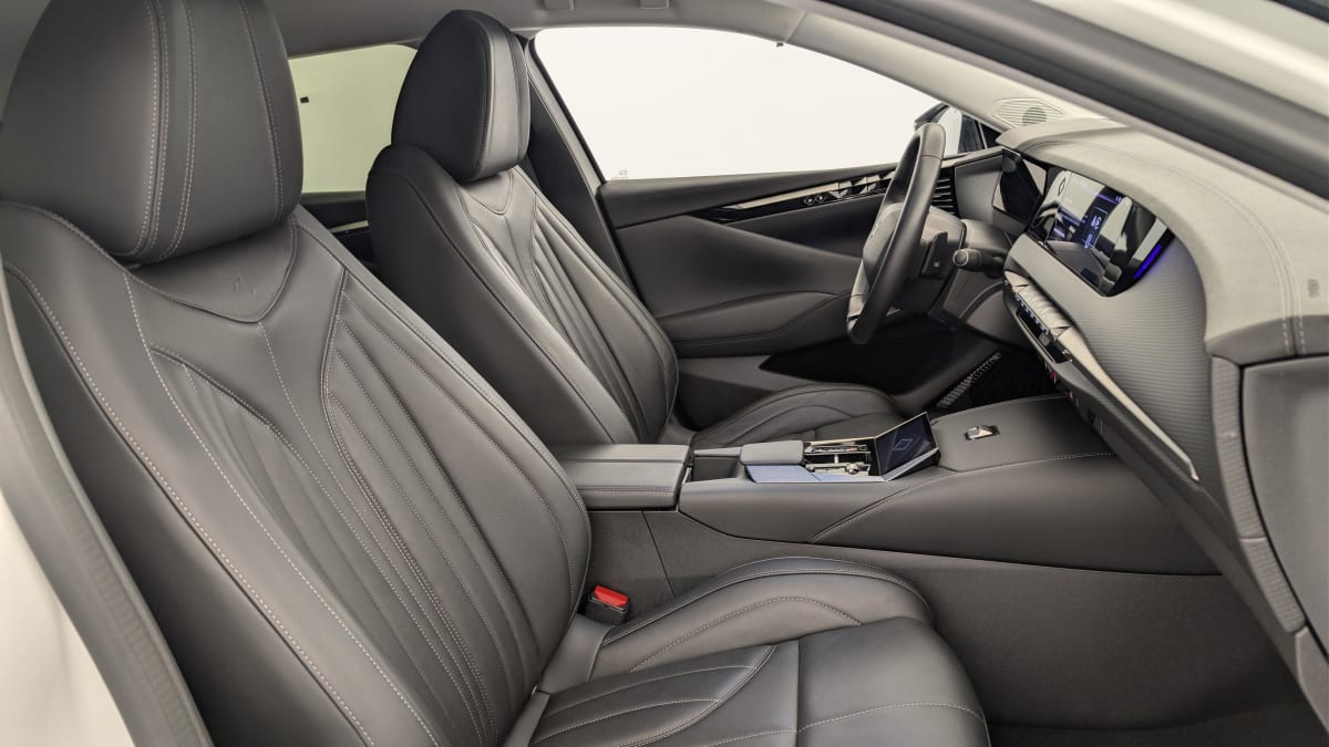 intérieur cuir grainé noir basalte et toile ds : ciel de pavillon clair décors de panneaux de porte chrome guilloché volant en cuir fleur mistral console centrale en toile ds mistral planche de bord en toile ds noir basalte façon écaille panneaux de portes en toile ds noir basalte façon écaille sellerie en cuir grainé noir basalte et toile ds