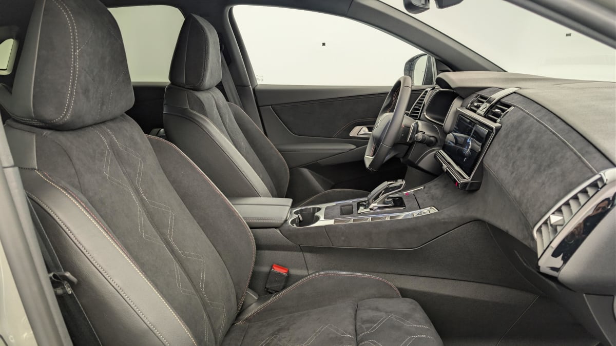 intérieur alcantara noir profond : console centrale en alcantara noir profond panneaux de portes en alcantara noir profond et surpiqûres carmin et or planche de bord alcantara noir profond et surpiqûres carmin et or volant cuir fleur perforé et coutures carmin et or sièges alcantara noir profond avec toile ds