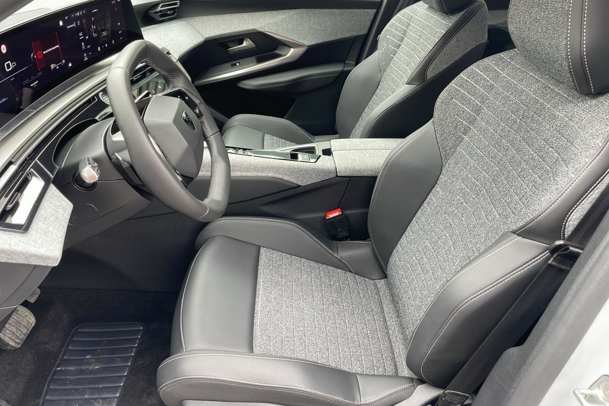 eléments de style intérieure planche de bord moussée avec décor tissu rimini chiné et alcôve graphène, façade et aérateurs noir laqué avec décor gris stène, panneaux de portes avec décor tissu rimini chiné, alcôve graphène et jonc gris stène, accoudoirs tep isabella, surpiqûres quartz à l'av, console centrale avec décor tissu rimini chiné, façade noir laqué et jonc gris stène, accoudoir tissu rimini chiné