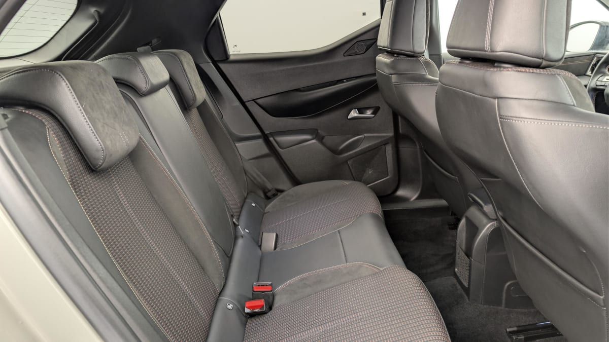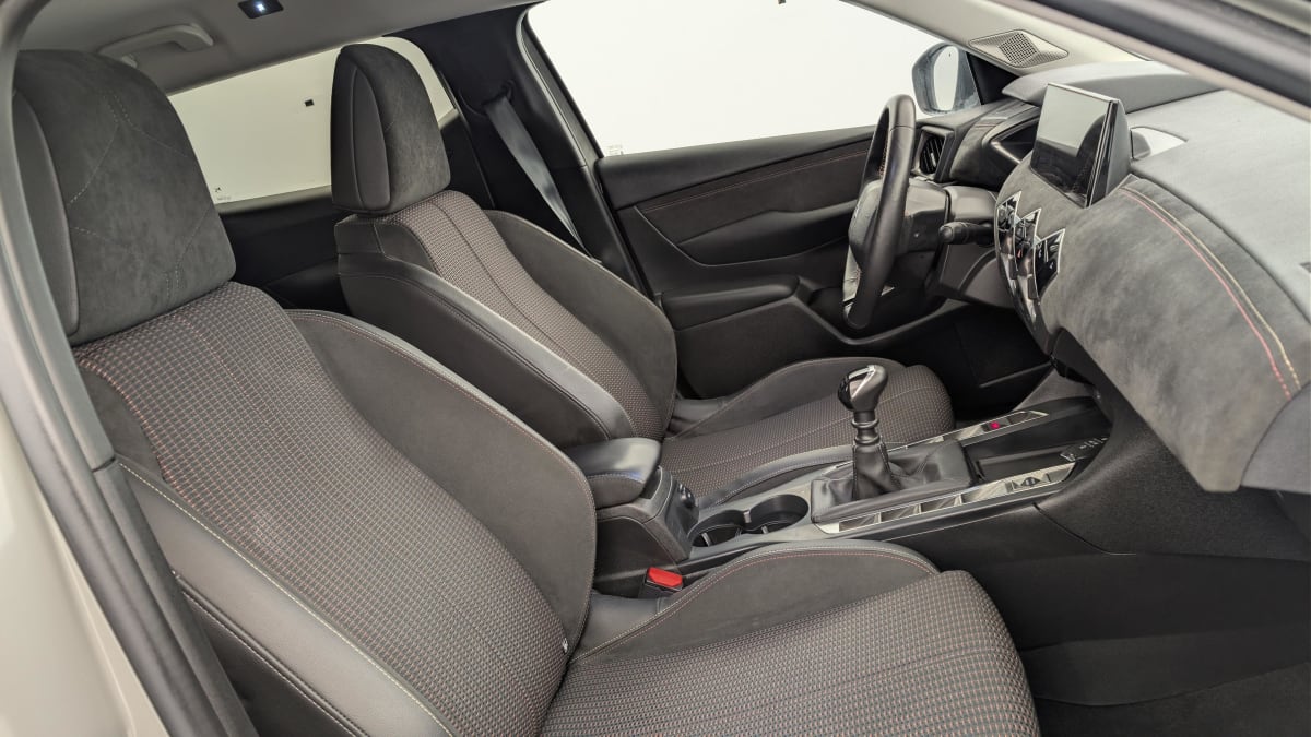 intérieur tissu tressé basalte avec alcantara : planche de bord alcantara noir ciel de pavillon gris galet volant cuir fleur perforé et coutures or et carmin décor alcantara noir siège tissu tressé basalte avec alcantara