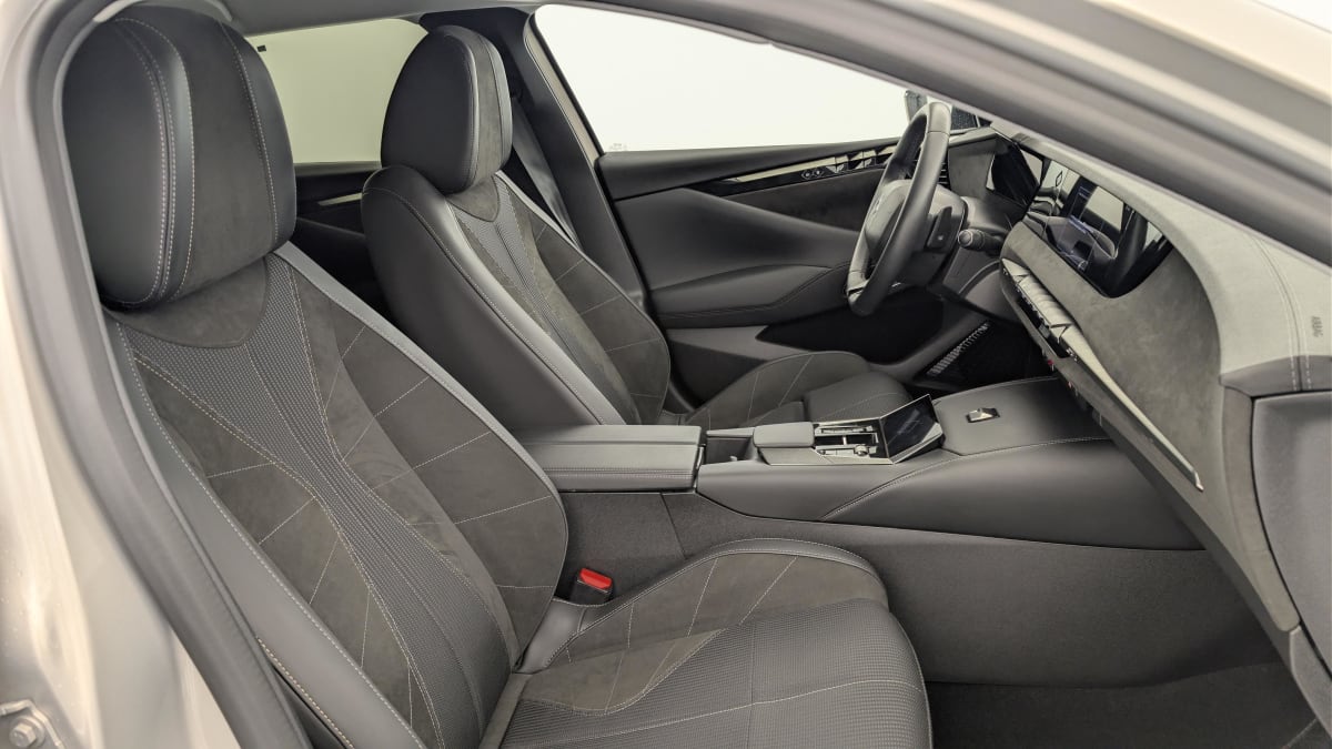intérieur alcantara noir : planche de bord en alcantara ciel de pavillon clair sellerie en tissu tressé basalte avec alcantara et toile ds décors de panneaux de porte chrome guilloché volant cuir fleur mistral console en toile ds noir basalte panneaux de porte en alcantara et toile ds noir basalte