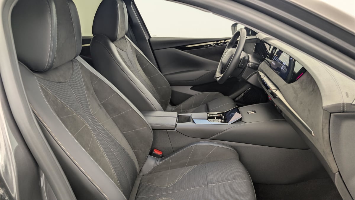 intérieur alcantara noir : planche de bord en alcantara ciel de pavillon clair décors de panneaux de porte chrome guilloché volant cuir fleur mistral console en toile ds noir basalte panneaux de porte en alcantara et toile ds noir basalte sellerie en tissu tressé basalte avec alcantara et toile ds