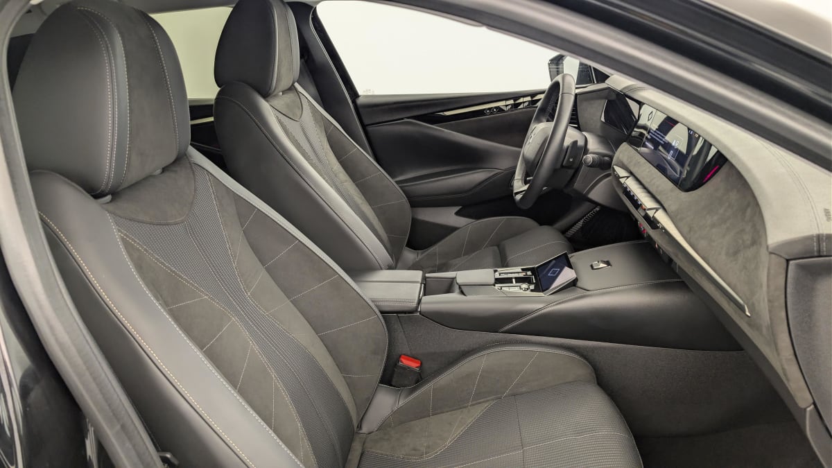 intérieur alcantara noir : planche de bord en alcantara ciel de pavillon clair décors de panneaux de porte chrome guilloché volant cuir fleur mistral console en toile ds noir basalte panneaux de porte en alcantara et toile ds noir basalte sellerie en tissu tressé basalte avec alcantara et toile ds